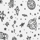 Playful space-themed doodle pattern featuring rockets, planets, stars, and comets in black and white. Perfect for space lovers and sci-fi designs.