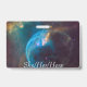 (Image description: A rectangular badge with a space phenomenon with blue, white, pink and yellow colors, surrounded by a light blue circle. On the bottom, in white script, the words She/her/hers. On the other side, in black script on plain white background, the words 'my pronouns are she/her/hers')