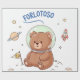 An adorable teddy bear astronaut sits happily on a tiny planet, dreaming among stars and rockets.