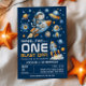 Set against a vibrant navy blue and orange galaxy background, this gender-neutral invitation is perfect for little explorers — whether boy or girl — celebrating their first trip around the sun. The playful “3…2…1… Blast Off!” headline adds excitement, making it ideal for a space-themed first birthday party.