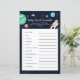 Cute space theme baby shower baby word scramble card featuring illustration of planets, astronaut, and stars. The list of words on this card are all related to babies and they are scrambled. The guests are going to compete who can unscramble all of them first! ANSWER KEY: 1. car seat 2. milk 3. playpen 4. pacifier 5. diaper 6. rocking chair 7. nursery 8. baby monitor 9. swaddle 10. formula 11. rubber ducky 12. stroller.