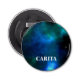 A custom bottle opener with a blue space background. Add your own name to this product by using the custom template.