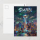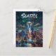 The colors of the night are moody and maritime, featuring deep emeralds, cool grays, and pops of neon magenta. The light reflects off the damp pavement and the dark water, giving the entire scene a fresh, rain-kissed glow that is uniquely Seattle.