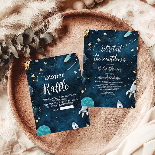 Cosmic Design: Navy-blue background adorned with sparkling stars, planets, and rocket ship accents to complement your space theme.
