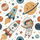 Playful rocket ships, planets, and stars in a vibrant space theme