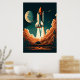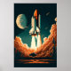 This depicts a powerful space rocket as it blasts off from the launchpad and heads towards the infinite expanse of outer space. The rocket is surrounded by billowing clouds of smoke and flames, adding to the drama and excitement of the scene. The poster is sure to delight anyone with an interest in space travel and exploration.