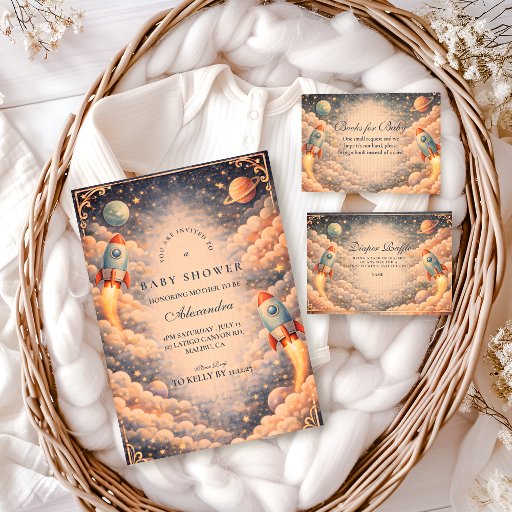 This dreamy celestial design features swirling pastel clouds, softly glowing stars, and whimsical planets drifting through a vintage night sky. The painterly textures and warm cosmic palette create a magical, storybook atmosphere—perfect for a celestial-themed celebration with an elegant, gender-neutral feel. Ideal for parents who love astrology, night skies, and timeless, imaginative designs that feel both modern and nostalgic.
