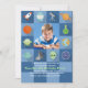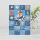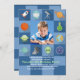A perfect invitation for your outer space enthusiast's birthday. The checkerboard blue on blue pattern features space-related icons and a center photo window.