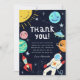 Cute thank you card for a kid's space theme birthday party featuring illustration of a galaxy in crayon including an astronaut, U.F.O., planets, stars, rocket. The message thanks the friends for coming and hoping that they had a BLAST. Customize this product by adding the child's name at the bottom.