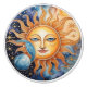 Faces of the sun, stars and moon in bright gold, orange and blue
