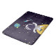 A bath mat with a dark blue background with yellow stars scattered around. Layered over top is an illustration of a spaceman wearing a white astronaut suit floating above the moon. Off in the distance is a planet with rings and a rocket ship flying off into the sky looking for new worlds to explore.