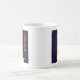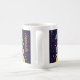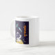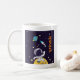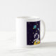a personalized mug with a dark blue background with yellow stars scattered around. Layered over top is an illustration of a spaceman wearing a white astronaut suit floating above the moon. Off in the distance is a planet with rings and a rocket ship flying off into the sky looking for new worlds to explore.
