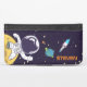Personalized phone wallet case with a dark blue background with yellow stars scattered around. Layered over top is an illustration of a spaceman wearing a white astronaut suit floating above the moon. Off in the distance is a planet with rings and a rocket ship flying off into the sky looking for new worlds to explore.