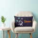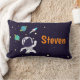 A personalized lumbar pillow with a dark blue background with yellow stars scattered around. Layered over top is an illustration of a spaceman wearing a white astronaut suit floating in space. Off in the distance are planets with rings and a rocket ship blasting off to places unknown.