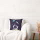 Pillow with a dark blue background with yellow stars scattered around. Layered over top is an illustration of a spaceman wearing a white astronaut suit floating above the moon. Waving hello as he explores space. Off in the distance is a planet with rings and a rocket ship flying off into space.
