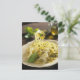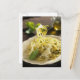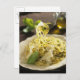 Spaghetti with basil and parmesan on plate, postcard