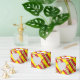 Personalized heart cutout favor box with the Spanish Flag and the word, SPAIN, below, in the colors of the flag. Design, shown tiled diagonally, has a white fractal of squiggly squares where you can add a name. Adding a name allows for a personalized touch by creating a favor box. Makes a lovely addition to a bon voyage party for your favorite traveler, or family reunion.
