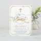 Modern, elegant Bautizo Invitation featuring white marble background , elegant gold cross, typography script Baptism in trendy gold lettering. To edit this template click customize further.