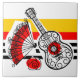 Whimsical design drawn in a retro style featuring souvenirs from a Spanish holiday; a wrought iron guitar, lacy fan and red rose on a striped background. A customizable design in black, white, red and golden yellow for you to personalise with your own text, images and ideas. An original digital art image.