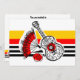 Whimsical design drawn in a retro style featuring souvenirs from a Spanish holiday; a wrought iron guitar, lacy fan and red rose on a striped background. A customizable design in black, white, red and golden yellow for you to personalise with your own text, images and ideas. An original digital art image.