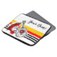 Whimsical design drawn in a retro style featuring souvenirs from a Spanish holiday; a wrought iron guitar, lacy fan and red rose on a striped background. A customizable design in black, white, red and golden yellow for you to personalise with your own text, images and ideas. An original digital art image.