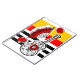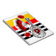 Whimsical design drawn in a retro style featuring souvenirs from a Spanish holiday; a wrought iron guitar, lacy fan and red rose on a striped background. A customizable design in black, white, red and golden yellow for you to personalise with your own text, images and ideas. An original digital art image.