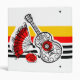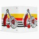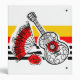 Whimsical design drawn in a retro style featuring souvenirs from a Spanish holiday; a wrought iron guitar, lacy fan and red rose on a striped background. A customizable design in black, white, red and golden yellow for you to personalise with your own text, images and ideas. An original digital art image.