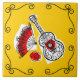Whimsical design drawn in a retro style featuring souvenirs from a Spanish holiday; a wrought iron guitar, lacy fan and red rose. A customizable design in black, white, red and golden yellow for you to personalise with your own text, images and ideas. An original digital art image.