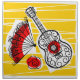 Whimsical design drawn in a retro style featuring souvenirs from a Spanish holiday; a wrought iron guitar, lacy fan and red rose. A customizable design in black, white, red and golden yellow for you to personalise with your own text, images and ideas. An original digital art image.