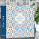 Personalized recipe binder with Spanish Tiles pattern in blue and orange. The titles on the front and the spine can also be customized and are lettered in blue and white typography. The wording currently reads "[name's] Mediterranean Recipes" with RECIPES and Mediterranean on the spine.
