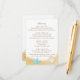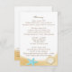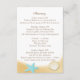 Gold Seashells and aqua starfish decorate this pretty beach wedding invitation information card. Itinerary on one side and accommodations on the other side. Personalize text as preferred.