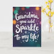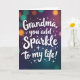 This greeting card features a loving message for a grandma placed right in the center, reading “Grandma, you add Sparkle to my life!” in crisp white lettering with a soft shadow that helps it stand out. The words curve gently across the middle, giving the line a tender, affectionate tone that feels like a warm hug ❤️. Small white dots and tiny four-point star shapes are scattered around and between the letters, like little glints that echo the word “Sparkle.” Behind the message, the background fades through deep indigo and rich violet into teal and warm amber, creating a cozy, romantic glow. Blurred circles of light float across the scene like distant string lights, adding a quiet sense of closeness and celebration 🌼. The text stays clearly centered while the brightest color shifts drift around it, drawing your eyes back to the message. White sparkles and bokeh lights cluster more densely near the middle and soften toward the darker edges.