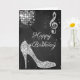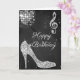 Women's elegant birthday greeting card with glitz and glamour. Woman's beautiful black and white greeting cards with a funky retro disco mirror ball, glamorous printed image rhinestones, glitter, sequins, bling jewels sparkle high heels stilettos shoes, and glittery musical notes / music notes with sparkles on a vibrant silver lights and sparkles background. Chic, classy, cute, girly, modern cards for women and girl's in trendy, fashionable colors. These groovy, fancy, stylish, sophisticated, pretty, girly cards.. PLEASE NOTE: All products on Zazzle have flat printed images. If you need any assistance customizing your product please contact me through my store and I will be happy to help.