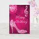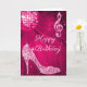 Women's elegant birthday greeting card with glitz and glamour. Woman's beautiful hot pink and white greeting cards with a funky retro disco mirror ball, glamorous printed image rhinestones, glitter, sequins, bling jewels sparkle high heels stilettos shoes, and glittery musical notes / music notes with sparkles on a vibrant pink lights and sparkles background. Chic, classy, cute, girly, modern cards for women and girl's in trendy, fashionable colors. These groovy, fancy, stylish, sophisticated, pretty, girly cards.. PLEASE NOTE: All products on Zazzle have flat printed images. If you need any assistance customizing your product please contact me through my store and I will be happy to help.