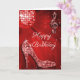 Women's elegant birthday greeting card with glitz and glamour. Woman's beautiful red and white greeting cards with a funky retro disco mirror ball, glamorous printed image rhinestones, glitter, sequins, bling jewels sparkle high heels stilettos shoes, and glittery musical notes / music notes with sparkles on a vibrant red lights and sparkles background. Chic, classy, cute, girly, modern cards for women and girl's in trendy, fashionable colors. These groovy, fancy, stylish, sophisticated, pretty, girly cards.. PLEASE NOTE: All products on Zazzle have flat printed images. If you need any assistance customizing your product please contact me through my store and I will be happy to help.