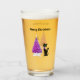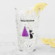 This glass tumbler for beverages has a sparkling pink and silver tree on a white star rub next to a pretty black cat wearing a pink bow on the front and back. Customise your text on the front and back with the templates.