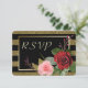 This elegant RSVP card combines modern and chic with traditional wedding roses. It features a stunning image of pink and red roses with greenery and buds at the bottom. The image is laid over a shiny gold frame. Your custom text is in light gold at the center. All is placed on a dramatic black and faux glitter gold stripe background. The back of the invitation is white to allow your respondent to easily mark it. Elegant, trendy, and appropriate for weddings in any season! Be sure to see the matching wedding products, including invitations, in our store. *Please note - the image is printed and the background contains no actual glitter.