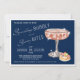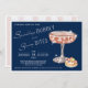 Fancy happy hour invitation that remains easy to update with your particulars. Features a "sparkling" glass of bubbly champagne with a delicious looking treat next to it. Beautiful font reads "Sparkling Bubbly and Savory Bites" in the middle, all placed on a dark blue background to make it "pop". Reverse side is a complementary white and champagne-colored stripe design.