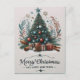 A festive Christmas card featuring a colorful Christmas tree adorned with ornaments and twinkling lights, surrounded by beautifully wrapped presents.