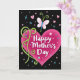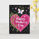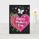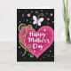 This card features a large fuchsia heart at the center, sprinkled with a glitter-like texture that makes it feel extra affectionate ❤️. Across the heart, the words “Happy Mother’s Day” appear in flowing white lettering, stretching neatly from left to right so the message stands out right away. A lime-green curling vine sweeps up along the left side, dotted with tiny sparkles and shaped in gentle loops that add a friendly, romantic flourish. Near the top, a small butterfly with pale pink wings and a turquoise body hovers as if drawn toward the heart, with curled antennae that echo the soft curves below 🌼. The background is deep black, making the pinks, greens, and blues pop like decorations under a spotlight. Scattered around are tiny pink hearts, light-blue stars, small cross shapes, and dots, floating across both the heart and the open space like confetti. The glittery textures on the heart, vine, and accents give the whole scene a slightly raised, shimmery look. The butterfly sits above the heart while the green vine curls along the left edge, with little symbols sprinkled across the black backdrop.