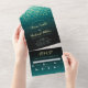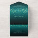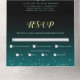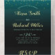 Sparkling lights in the sky teal and aqua blue winter night wedding invitation that showcases white and pale yellowish lights that sparkle on teal, aqua and turquoise blue gradient background. The names are in script typography and the tear off RSVP card can be detached.