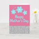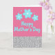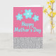 This card shows a rich fuchsia background filling the top two-thirds, setting a festive scene that feels like a warm hug ❤️. Centered in that upper area, the words “Happy Mother’s Day” are written in rounded cerulean-blue lettering with a slight raised look. Above the message, three stylized blue flowers with white centers and thin outlines float like a gentle crown, and small dotted accents scatter nearby for extra charm 🌼. The simple shapes and bright contrast give the layout a friendly, affectionate energy, like a tender note left where someone will surely see it. Along the bottom third, the design shifts into a dense field of silvery-gray and shimmering white speckles, resembling glittery fabric or frosted confetti. That sparkling base adds a cozy, lasting feel, as if the message is resting on something steady and cherished. The lower section is packed with tiny flecks that catch the eye against the darker gray, creating a textured band beneath the smooth fuchsia top.