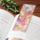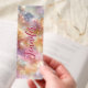 Discover a magical blend of warm pinks, golden yellows, and dreamy lavenders with this personalized bookmark. The background features a soft, seamless gradient of pastel colors, resembling a watercolor sunrise or sunset sky with softly blending clouds. An explosion of white, gold, and peach sparkles and starbursts, ranging from tiny pinpricks to radiant bursts like delicate fireworks, illuminates the design. Tiny bokeh effects and clustered sparkles create a shimmering path, adding depth and a dreamy, ethereal glow, evoking a dancing cosmic scene. Pure pastel perfection, this light, airy, and enchanting accessory invites you to gaze into a magical pastel cosmos with every read.