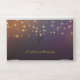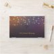 Rows of sparkly string lights hang across the top with a deep color background and gold script editable text. Party and event planners can customize this design to create a professional image.