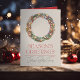 Sparkling wreath on off-white beige background with "season's greetings" and business name and year. Option for a message inside and a photo.