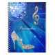 Elegant, glamorous personalised Notebook. Beautiful, dazzling, trendy printed image with Silver sparkles diamonds bling jewels musical note, funky blue retro disco mirror ball and silver stiletto high heel fashion shoe on a chic Blue printed image background. A cute, classy, fashionable, stylish, pretty gift for her or any music lover. Women and teenage girls will love this cool, fun, funky, girly design.