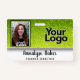 Faux lime green glitter sparkles delightfully behind a photo template with black and white frame. Easily update the name and professional job title for each custom employee badge. There is also space for a company logo—delete to leave blank. Backside features more faux glitter and an image template perfect for employee bar codes. Available in many other styles and colors.