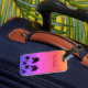 A touch of sparkly glamour on colorful, personalized luggage tag decorated with palm tree silhouettes.