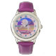 This is a pretty watch that any little girl would love! It features a sparkly pink rearing unicorn image against an abstract blue, purple, pink and yellow striped iridescent style background. Her name is in white at the lower left. The blue numbers on the outside pale pink border makes the watch easy to read. This design looks great with several of the wrist band colors, too...check them out!