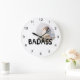 Photo of a small but rather aggressively looking at you sparrow and a text Badass. This is really a troublemaker. Funny wall clock.